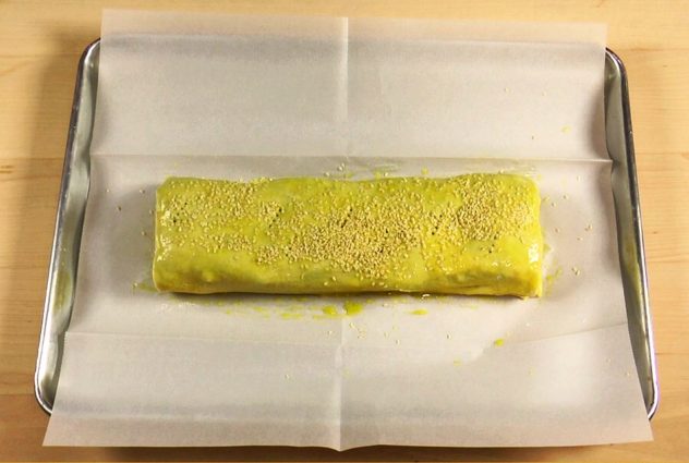 Heat oven to 400 f. In a deep bowl mix all filling ingredients. Roll puff pastry on a floured working surface to a 18X12 inch rectangle. Place filling in the center of the rectangle lengthwise, making a cylinder shape out of it. Brush beaten egg on the edge of the rectangle, Fold in the short edges and then the long ones. Place pastry on a baking sheet covered with parchment paper. Brush with beaten egg, sprinkle with sesame seeds and prick with fork in several places at the top of the pastry. Bake for 25 minutes until golden.