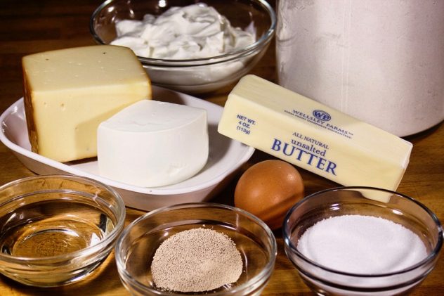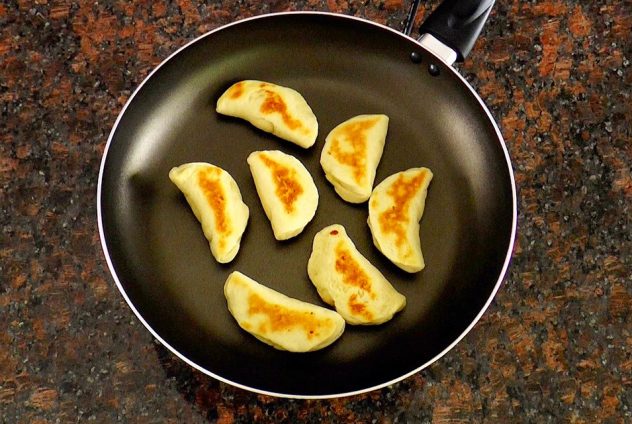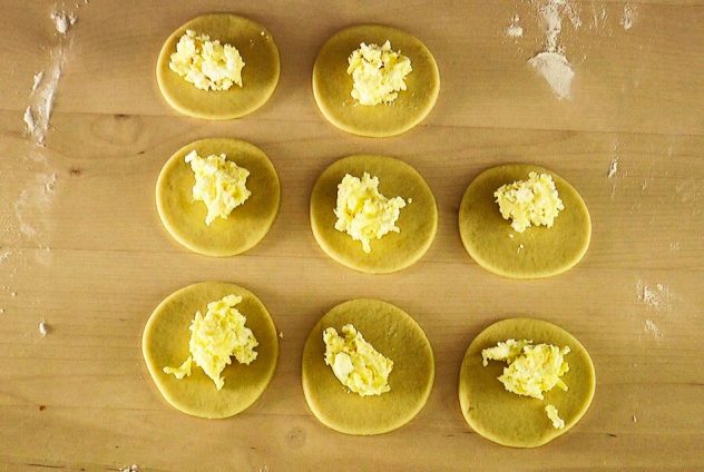 In a bowl mix cheese with egg. On a lightly floured surface roll the dough to thickness of ¼ of an inch. With a cookie cutter or a cup cut out round discs of 4 inch diameter. Place a spoonful of filling in the middle of each disc. Fold the disc and seal the edges by pressing the dough with your fingers.