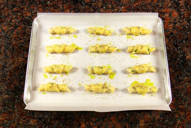 Warm oven to 350 f. Divide dough into two balls. Roll each ball to 1/8 of an inch thick disk. Place a large round plate on top of the dough and with a sharp knife cut the extra dough. Remove plate and using a pizza cutter slice dough to 8 triangles. Roll each triangle from wide side forward to croissant shape. Place on a baking sheet covered with parchment paper, brush with beaten egg, spread sesame seeds over and bake for 35 minutes until golden.