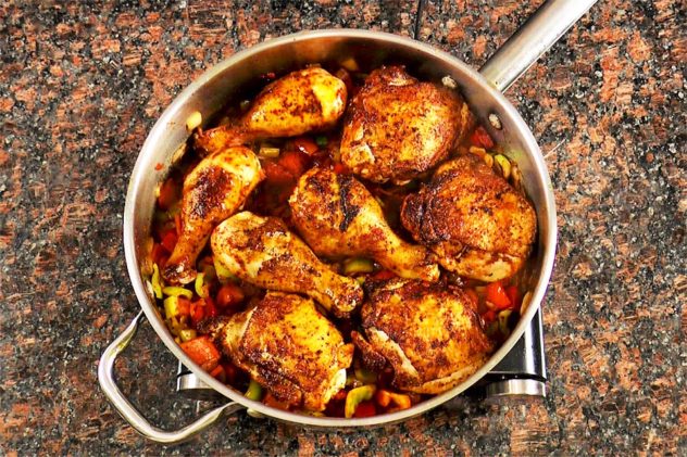 Heat oil in a deep pan or pot over medium high heat. Add the chicken and fry until both sides are golden. Remove the chicken and add onion to the same pan (add a little oil if needed) and fry to golden. Add garlic and fry one more minute. Add all ingredients and spices and mix well. Place chicken on top in one layer. Cover with water and bring to boil. Lower heat and cook 1 ½ hours over low heat.