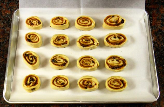 Mix brown sugar and cinnamon in a small bowl. Roll dough to rectangle ¼ inch thick. Spread soft butter all over dough. Sprinkle sugar cinnamon mix over buttered dough. Sprinkle with raisins and press lightly into the dough. Beginning at the long side, roll dough up. Cut into 1 inch slices and lay them on a baking sheet covered with parchment paper. Cover with plastic wrap and let rise 30 minutes.