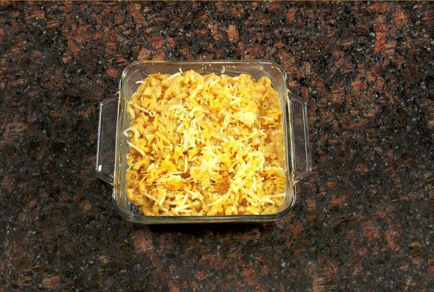 In a large mixing bowl combine cooked pasta and sauce. Pour into a well greased 8×8 inch baking dish. Sprinkle remaining cheese on top and bake for about 20 minutes until golden.