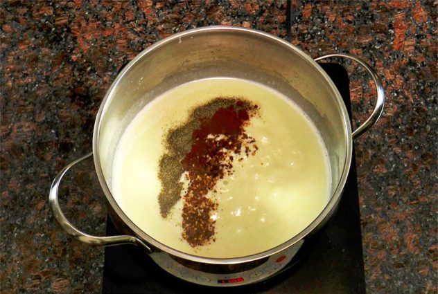 Heat oven to 350 f. Melt butter in a saucepan over medium heat. Add flour and whisk. Add milk and continue to cook while whisking constantly until it thickens. Add spices and whisk. Add cheese and whisk until melted. Remove from stove.