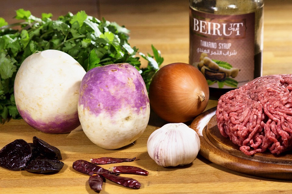 Heat a little oil in a deep pan or pot that can accommodate the turnips in one layer densely. Fry the onion to golden. Add the garlic and fry lightly. Add the tamarind syrup, wine and spices, mix and bring to boil. Add the turnips in one layer. If there is any room left add a potato so turnips won’t fall during cooking. Add water to cover the turnips. Lower heat and cook for 1 ½ hours.