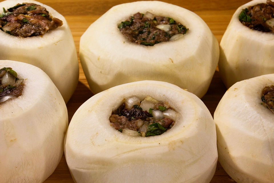 Mix all filling ingredients. Stuff each turnip with a generous amount of filling and press it in.