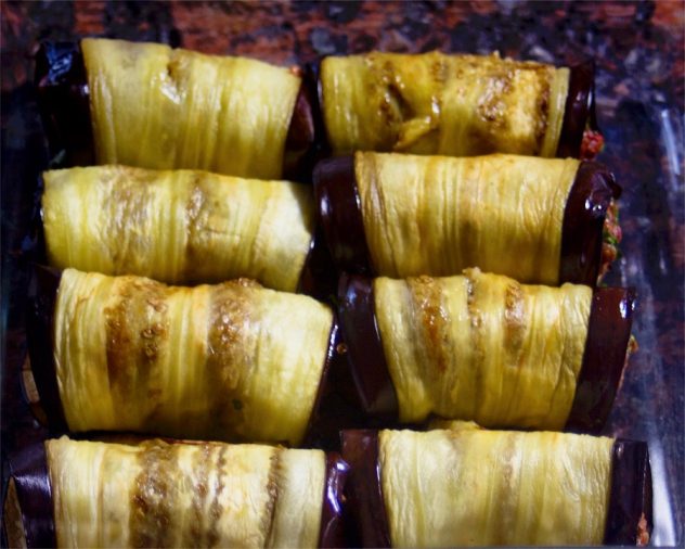 Lower oven heat to 350. Mix all filling ingredients in a bowl.Place an eggplant slice on working surface. Roll a small beef roll and put on eggplant’s wide side. Roll and place in baking pan. Pour sauce over the eggplants and bake for 1 hour.
