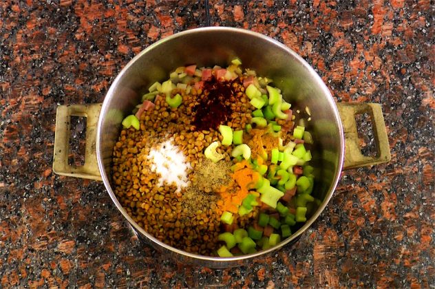 Wash the lentils under running water and strain. In a large deep pot heat olive oil. Add onion and fry to golden. Add garlic and fry one more minute. Add bones and smoked beef and fry 2-3 minutes. Add lentils, celery and spices and mix well. Steam for 2-3 minutes over high heat. Add water and bring to boil. Lower heat and cook for an hour. After an hour check to see if lentils are tender. I like them al dente, but if you like your lentils softer cook until they suit your taste. Correct seasoning and add lemon juice and cilantro. Cook for 15 minutes more. Pour into plates, garnish with chopped cilantro and enjoy every spoonful.