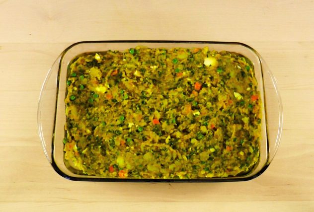 Heat oven to 350 f. Place cooked potatoes and hard boiled eggs in a deep bowl and mash. Add all other ingredients beside the oil and mix well. Oil a 9×13 pan. Pour mix in and level. Bake about 45 minutes until brown.