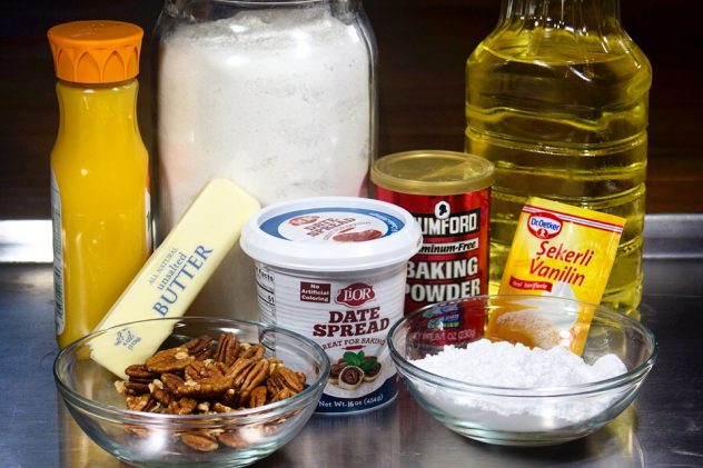 Place flour, sugar, baking powder and vanilla sugar in a mixer bowl with kneading paddle and stir. Add butter, oil and orange juice and knead only until dough is formed. Wrap in plastic wrap and cool for about an hour.