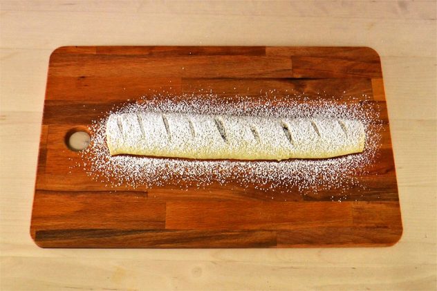 Bake for 30 minutes, until light golden. Take out of the oven, and let chill a little. Sprinkle generously with powdered sugar and slice the roulade according to the slots marked earlier while it still warm. Let cool, and try to leave some for the rest of the family.