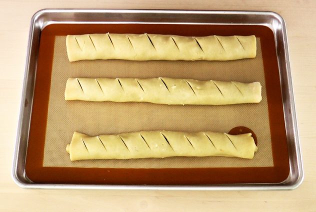 Heat oven for 350 F. Divide the dough into three equal parts. Roll out each part of a rectangle about ⅛ of an inch thick. With a sharp knife or pizza cutter, cut the edges from the rectangle to get straight edges. Spread thin layer of dates spread on each rectangle, leave a ⅓ inch margins. Spread about two tablespoons of crushed pecans and roll to roulade. Place in a baking sheet covered with baking paper, and Using a sharp knife, cut a slots ½ inch apart.