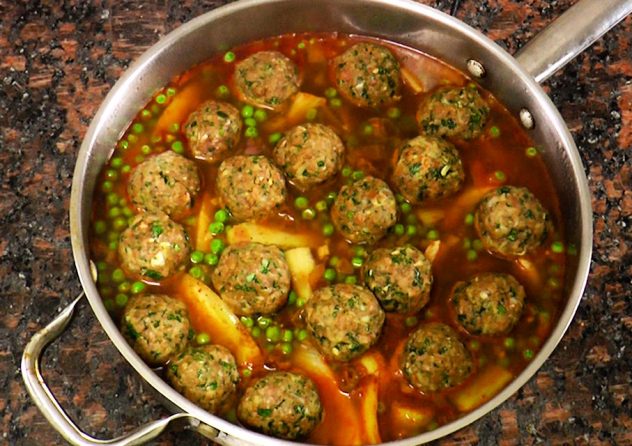 In a deep pan (or pot) heat olive oil over medium high heat. Add red onion and fry until transparent. Add garlic and green hot pepper and fry 1 more minute. Add celery sticks, fennel, green peas and the spices and stir. Cover and cook for 3 minutes. Add 2-3 cups of water and bring to boil. Add the meatballs, lower heat and cook for 1 hour.