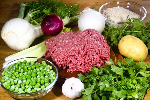 Place the ground meat in a large bowl. Add the chopped herb mix, grated potato, penco and meatballs’ spices and mix well. Cover and refrigerated for 1 hour. Take out and make balls the size of golf ball.