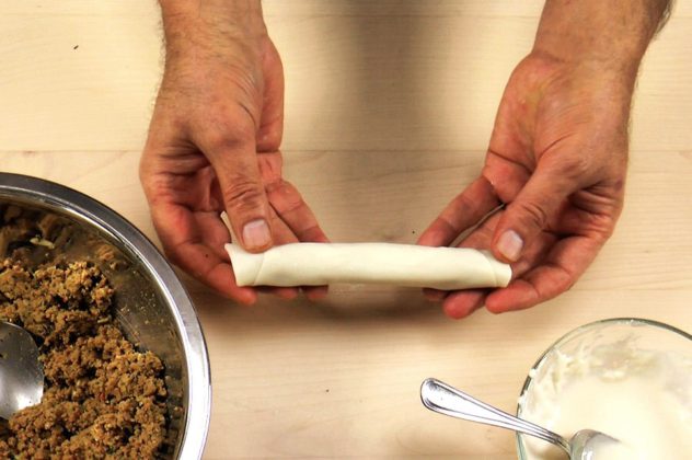 In a small bowl mix water and flour. take one spring roll wrapper and cut edges diagonally. Place a generous amount of the meat mixture near the wide end of the dough. Fold in the right and left sides of the dough, and roll into a cigar shape. Seal the edge with the flour and water mix.