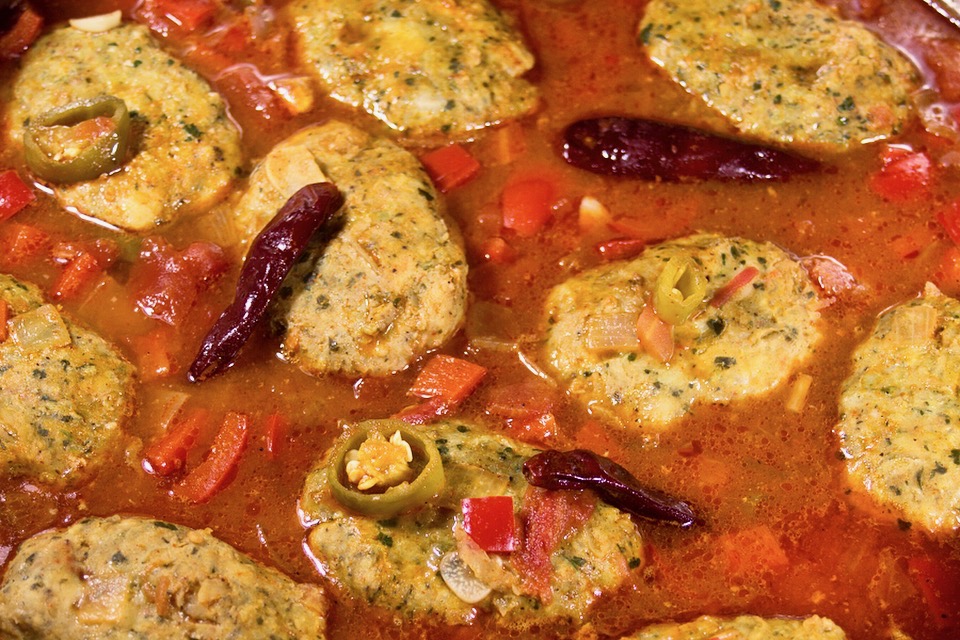 mom would put a piece of fish into the grinder, push it inward with an upside down wooden spoon, and start turning the grinder handle. While turning the handle of the grinder, she would put in a few pieces of onion, a clove of garlic, a little parsley, a little coriander and a piece of bread. Out of the exit hole, a colorful mix of the ingredients came out. That way she would continue, in the same order, until all the ingredients of the patties turned into an herb-dotted mix. She would add eggs, breadcrumbs and spices to the mix, form elongated patties, and put them one by one into the pan with the bubbling tomato sauce. Though I didn’t eat fish, not even fish patties, I always loved helping mom grind meat or fish, fascinated by the raw ingredients changing their texture.