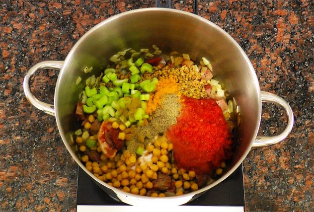 Heat olive oil in a deep pot to medium high heat. Fry onions to golden. Sprinkle the meat cubes with salt and pepper. Add beef bones and meat to the pot and continue frying for 3-4 minutes. Add chickpeas, lentils, celery stalks and grated tomatoes, mix well and cook for 4 minutes. Add about 8-10 cups of water and bring to boil. Lower heat and simmer for 1 ½ hour until fully cooked and tender. Taste and adjust seasoning if necessary.
