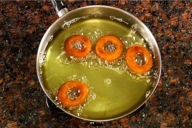 Heat 3 inch high oil in a deep pan. When oil is hot but not boiling, insert dough circles. Fry 1-2 minute each side until circle floats and turns golden.