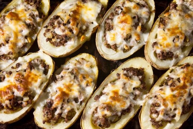 Lower oven heat to 375. Cut roasted potatoes into half lengthwise. With a parisienne spoon (or regular one if you don’t have one) carve the potato pulp and place in a bowl. Leave edges of ¼ inch. Mash the pulp with potato masher and add into the meat, and mix well. Fill each potato half with the filling generously, place in a baking pan and spread grated mozzarella cheese on each one (if you keep kosher you can do without the cheese). Bake 30 minutes to golden. Serve warm.