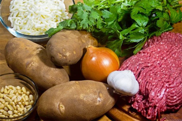 In a deep pan heat olive oil over medium high heat. Add onion and fry until transparent. Add garlic and fry 1 more minute. Add ground beef and all other filling ingredients and spices and cook until meat changes its color. Let cool.
