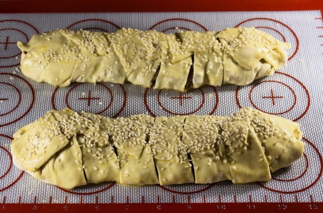 Over floured surface, cut the puff pastry in half and roll each half to a 16×10 inch rectangle (one leaf makes 2 roulades). With a sharp knife cut slots on the long side of the rectangle, 3 inch deep (about ⅓ of the rectangle) and 1 inch apart. Place half of the filling in the middle of the rectangle, and fold the stripes crisscross until all the filling is covered. Brush with washed egg, spread sesame seed on top and bake for 30 min until top is golden.