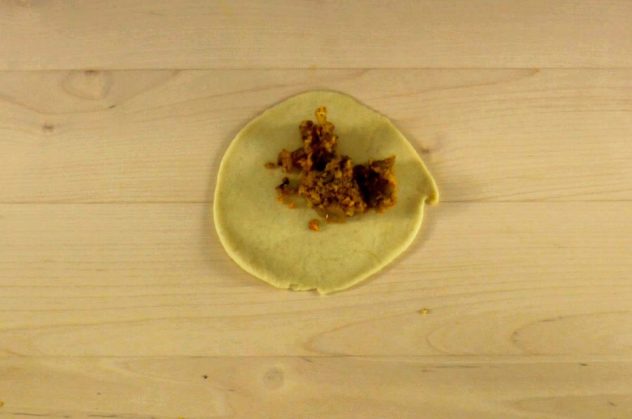 Divide dough into small balls the size of a ping pong ball. Roll each ball to a disk ⅛ inch thick. Place a full spoon of filling in the center of each disk, fold and tighten the edges.