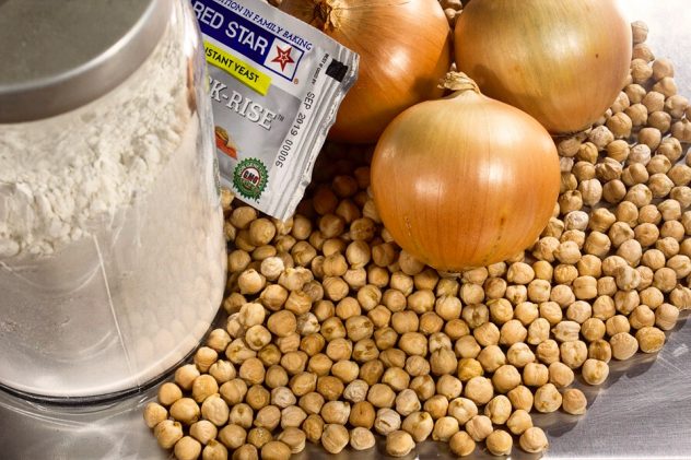 Place cooked chickpeas in a food processor bowl with metal blade and grind coarsely. Transfer ground chickpeas to a bowl, add fried onion and spices and mix well.