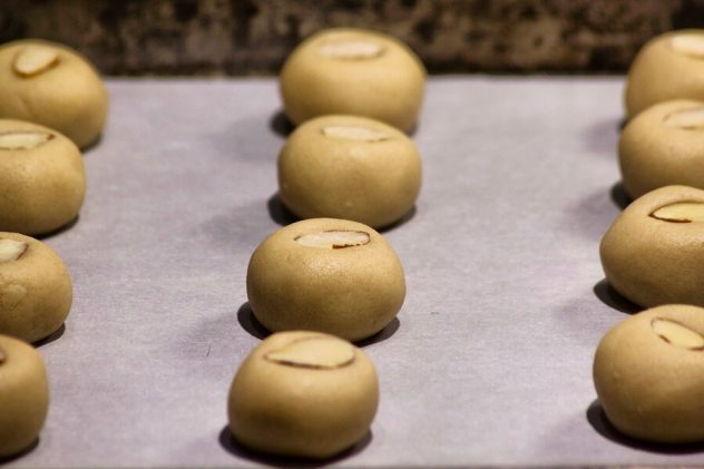 Heat oven to 350 degrees. cover baking sheet with parchment paper. Roll balls to the size of a pingpong ball and place on the sheet, leaving a 1 inch space between balls. Press half an almond on each ball, and bake for 18 minutes until cookies are slightly cracked. The cookies should be bright and soft, they gets hard after they cool down. spread sugar powder and keep in closed container for up to 4 days (if you can help it).