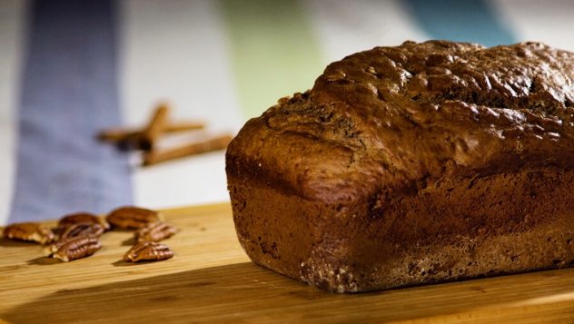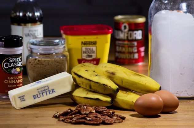 מחממים תנור ל 350 פרנהייט / 180 צלזיוס. בקערת מיקסר עם וו גיטרה מקרימים במהירות גבוהה את החמאה והסוכר. מוסיפים את הביצים, מורידים למהירות נמוכה, וממשיכים לערבל עד שהן נטמעות. מוסיפים את הבננות והוניל וממשיכים לערבל עד שהכל מתאחד. מוסיפים את החומרים היבשים למעט הפקאנים, ומערבבים רק עד שנוצרת עיסה אחידה. מוסיפים את הפקאנים, מערבבים ממש מעט.
