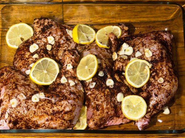 מחממים תנור ל 400 מעלות, מכניסים את העוף לתנור ל 15 דקות. מנמיכים את החום ל 350 מעלות, מכסים את התבנית בנייר כסף וממשיכים לצלות את העוף כשעה – עד שעה וחצי (אני אוהב שבשר העוף נופל מהעצם), עד שהוא מוכן ורך.
