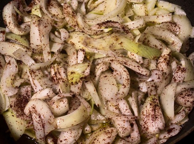 בנתיים במחבת עמוק מחממים ½ כוס שמן זית לחום בנוני. מכניסים את הבצל ביחד עם שארי הסומאק וקצת מלח ופלפל שחור. מטגנים על אש נמוכה כ 30 דקות.
