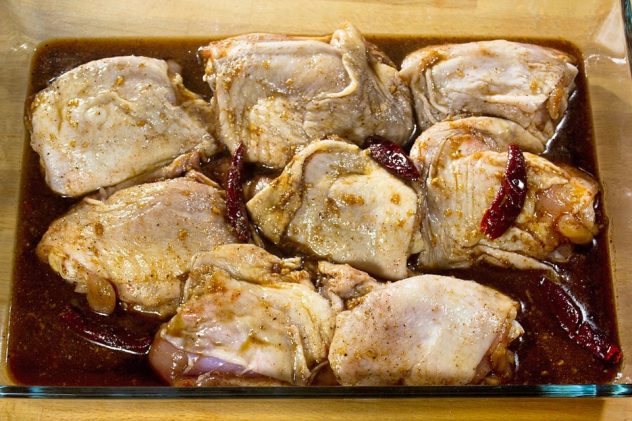 מערבבים את כל חומרי המרינדה בקערה גדולה. מוסיפים את נתחי העוף ומערבבים עד שנתחי העוף מצופים מכל הצדדים. משרים במקרר ל 4 שעות (עדיף ללילה).